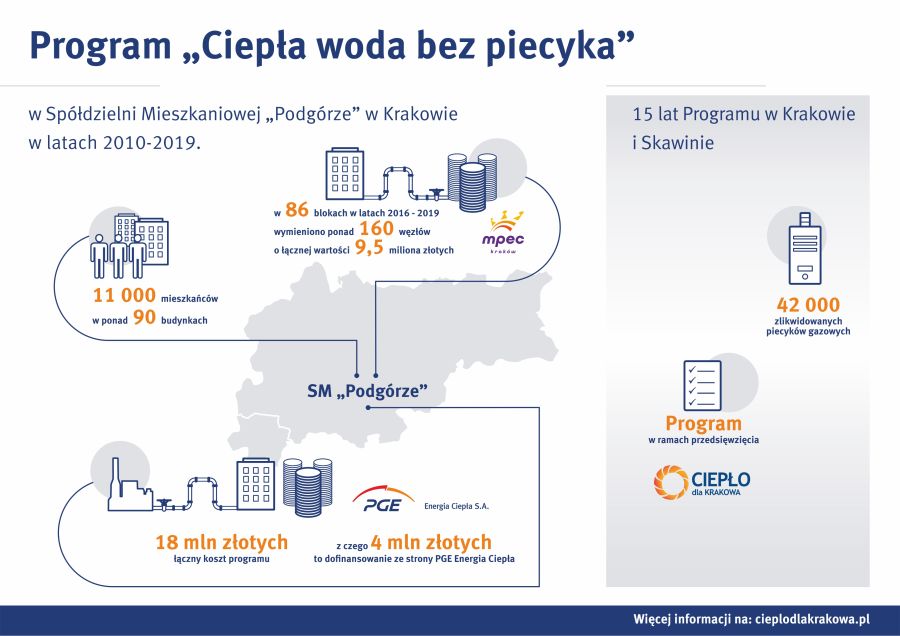 Około 11 tysięcy krakowian mieszka w ponad 90 blokach w Spółdzielni Mieszkaniowej „Podgórze”. W latach 2010–2019 przeprowadzony został tam wielki program zastąpienia piecyków gazowych instalacją centralnej ciepłej wody. Koszt programu wyniósł ponad 18 milionów złotych, z czego 4 miliony złotych – to dofinansowanie ze strony PGE Energia Ciepła, spółki z Grupy Kapitałowej PGE. Program „Ciepła woda bez piecyka” objął w sumie 90 bloków mieszkalnych, z których w 86 Miejskie Przedsiębiorstwo Energetyki Cieplnej SA (MPEC) zainstalowało w rekordowo krótkim czasie, tj. w ciągu trzech lat, ponad 160 węzłów o łącznej wartości 9,5 miliona złotych.