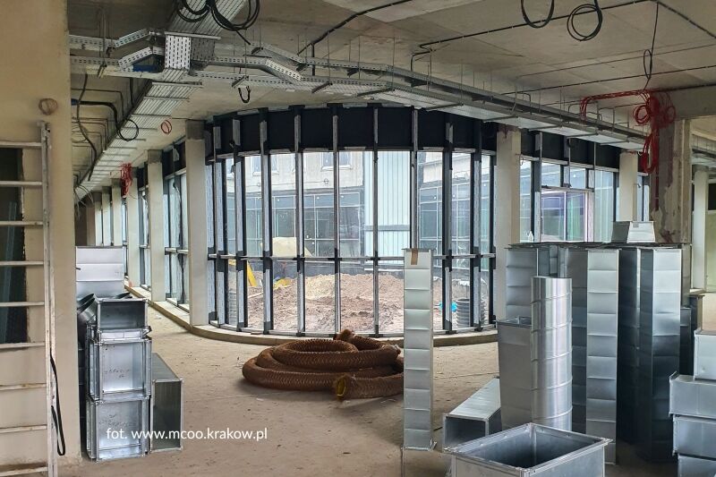 Przed ekipą budowlaną jeszcze ostatnie miesiące prac. Wykonano już tynki wewnętrzne, kończą się też roboty z zakresu instalacji podposadzkowych oraz wylewek. Gotowe są też główne ciągi instalacji wentylacji, na ukończeniu są prace w zakresie instalacji sanitarnych. W toku jest wykonywanie gładzi gipsowych i zabudów pionów instalacyjnych, a to już ostatni etap przed malowaniem sal. Równolegle trwają prace związane z zagospodarowaniem otoczenia budynku, a także wykonaniem termoizolacji.