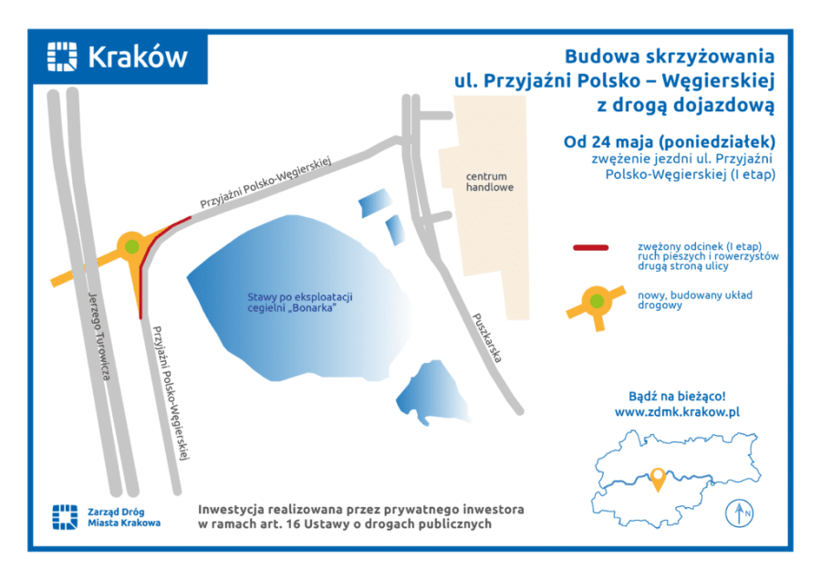 W Podgórzu Duchackim przy ul. Przyjaźni Polsko-Węgierskiej powstaje rondo wraz z drogą dojazdową. Deweloper w ramach swojej inwestycji buduje nowy układ drogowy, w tym rondo z trzema wlotami. 24 maja wprowadzony został pierwszy etap tymczasowej organizacji ruchu.