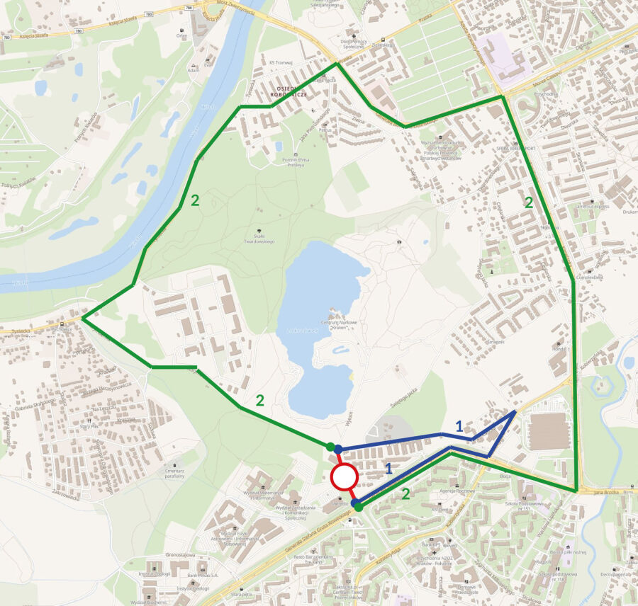 - objazd nr 2: ul. Tyniecka, ul. Praska, ul. Zielińskiego, ul. Kapelanka, ul. Grota Roweckiego.