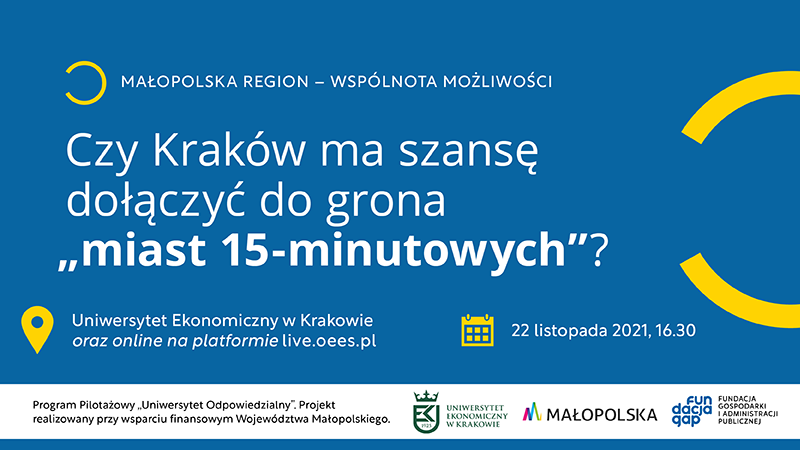 Rektor Uniwersytetu Ekonomicznego w Krakowie oraz Fundacja GAP zapraszają do udziału w debacie: „Czy Kraków ma szansę dołączyć do grona „miast 15-minutowych”?”. Wydarzenie odbędzie się dziś, 22 listopada, o godz. 16.30 na UEK oraz w formie online.