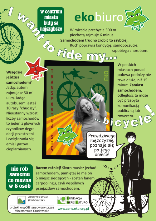 1. Przyjedź do pracy rowerem lub środkiem transportu publicznego, jeśli nie ma takiej możliwości postaraj się, aby w twoim samochodzie nie było wolnych miejsc – wspólny dojazd do pracy to oszczędność i mniejsza emisja CO2 do atmosfery!