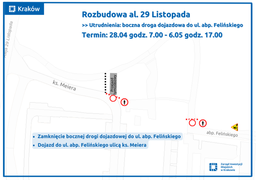 W okresie od 28 kwietnia do 6 maja został tam wyłączony ruch drogowy. Dojazd do ul. abp. Felińskiego zapewniony jest ulicą ks. Meiera.