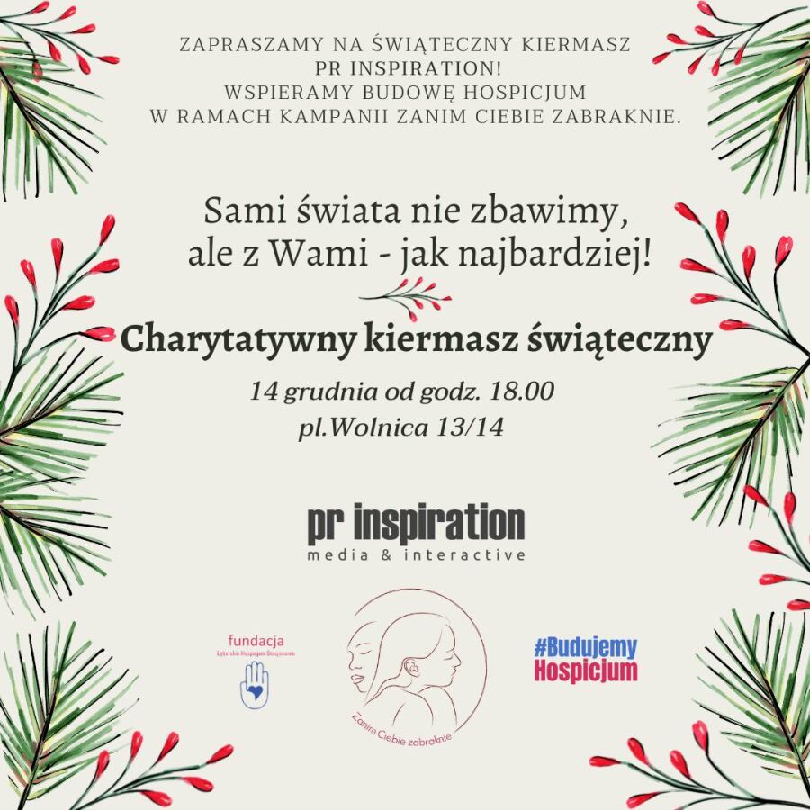 Dziś, 14 grudnia, w agencji PR Inspiration odbędzie się świąteczny kiermasz, z którego cały dochód zostanie przekazany na budowę Lęborskiego Hospicjum Stacjonarnego. Akcja odbywa się w połączeniu z trwającą ogólnopolską kampanią „Zanim ciebie zabraknie”.