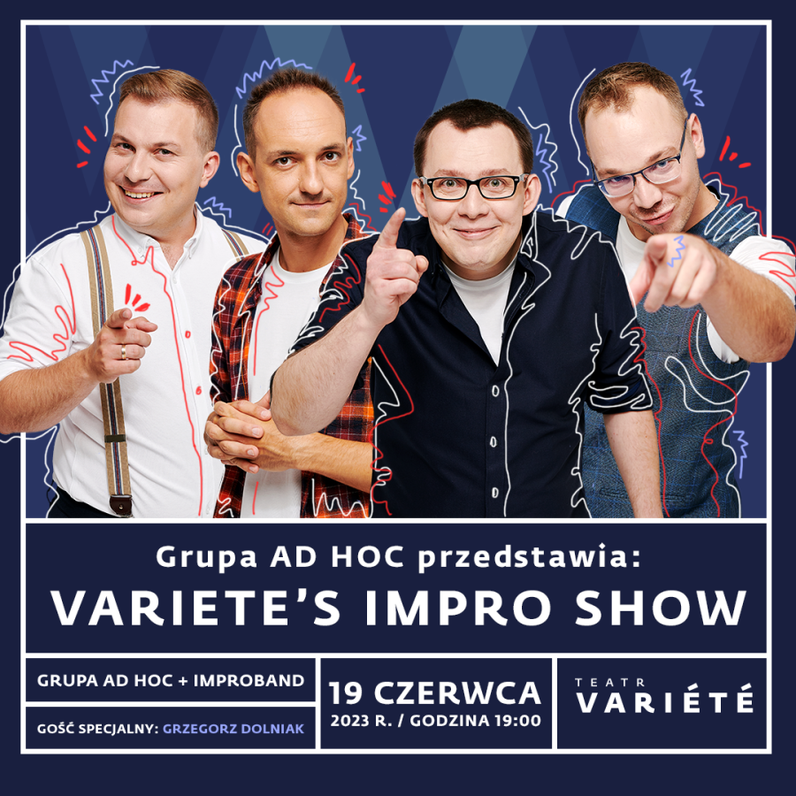 Grupa AD HOC powraca na scenę Teatru Variete w nowej odsłonie, z cyklem w pełni improwizowanych spektakli komediowych. „Variete’s Impro Show” to historie tworzone na oczach publiczności, piosenki które powstają „tu i teraz”. W każdym spektaklu pojawi się gość specjalny – doświadczony improwizator – który postara się po mistrzowsku wybrnąć z każdej sytuacji. W tej roli dzisiaj, 19 czerwca wystąpi Grzegorz Dolniak.