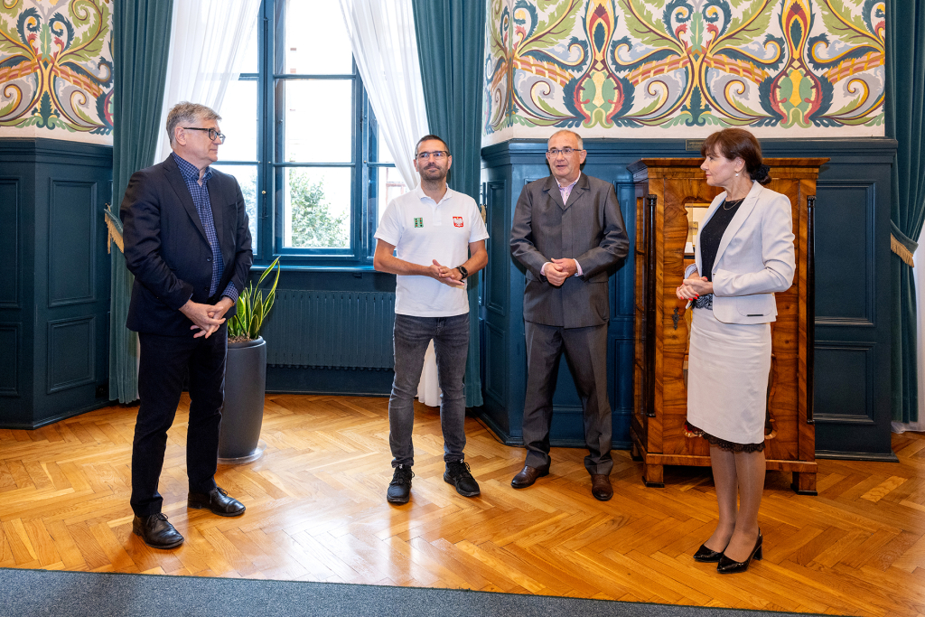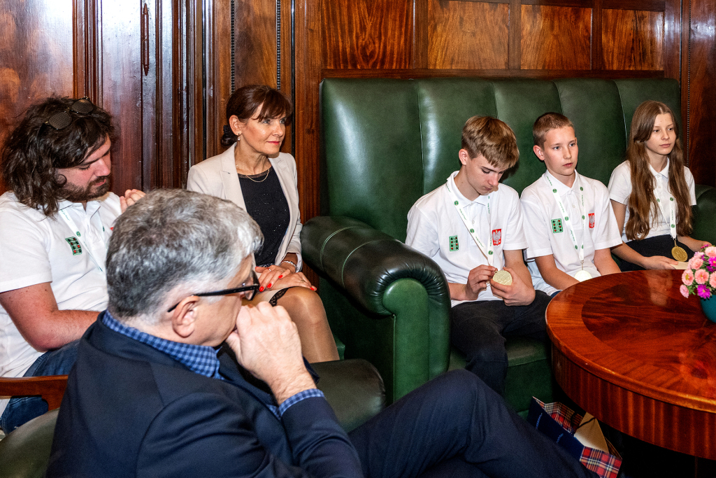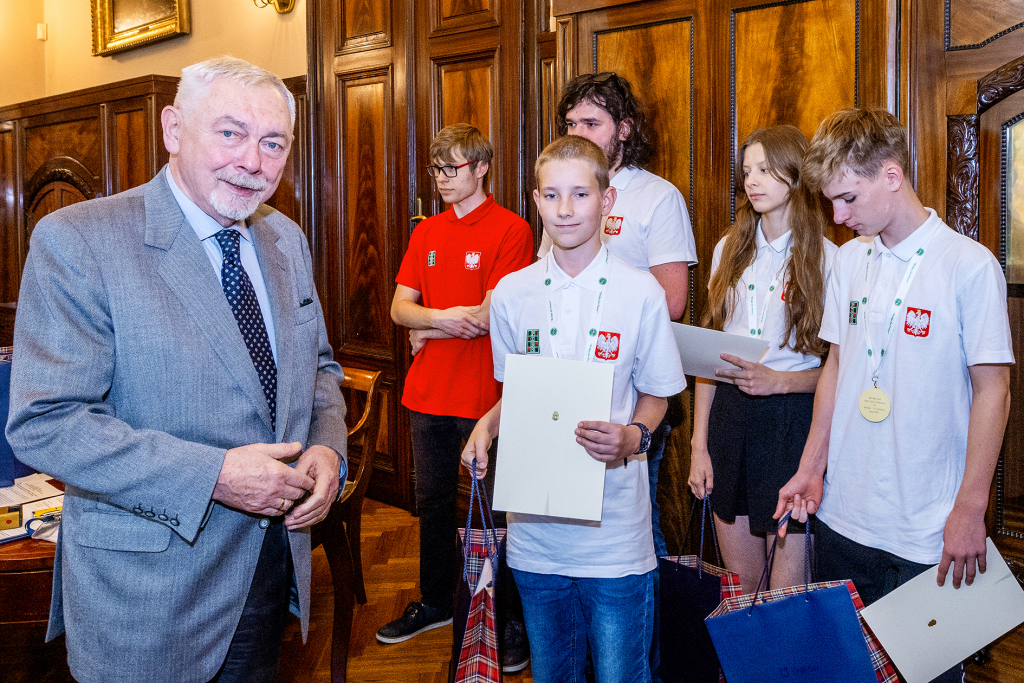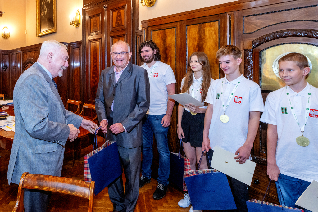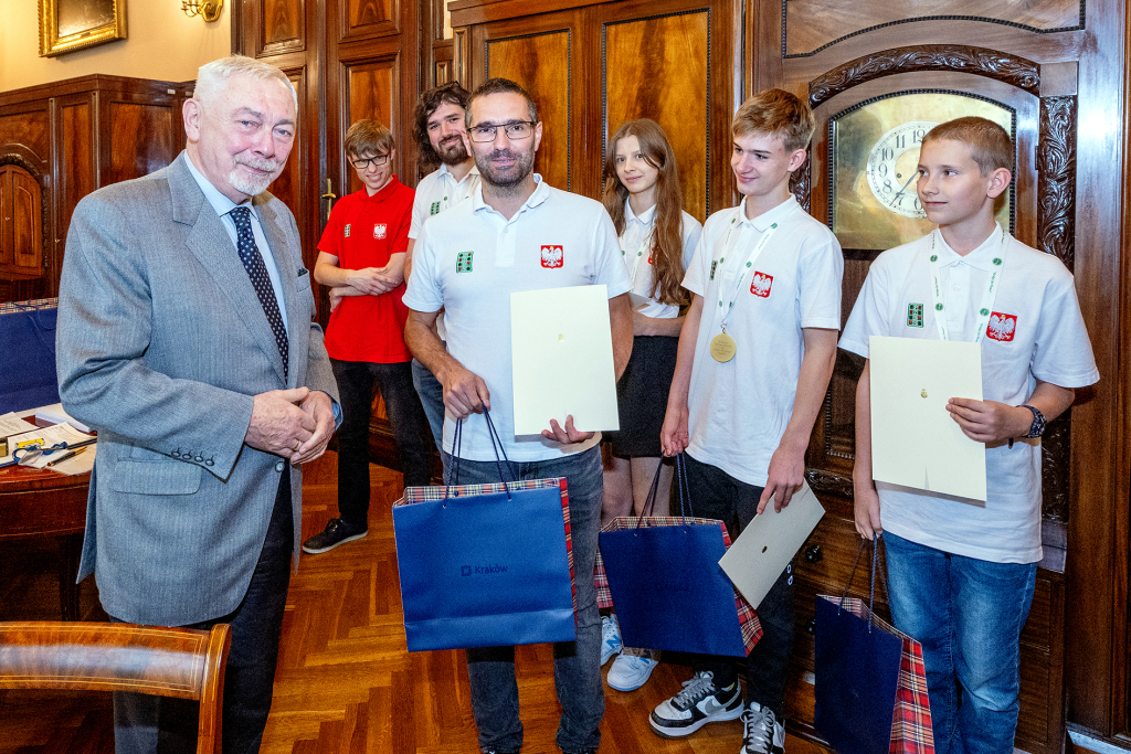 Czterech zdobywców złotego medalu w kategorii U16, dwóch zdobywców brązowego medalu w kategorii U26 oraz trener i wiceprezes Małopolskiego Związku Brydża Sportowego byli w poniedziałek, 25 września gośćmi prezydenta Krakowa, który pogratulował im sukcesów podczas 18. Drużynowych Mistrzostw Świata Juniorów w kategoriach U16 i U26 w brydżu sportowym.