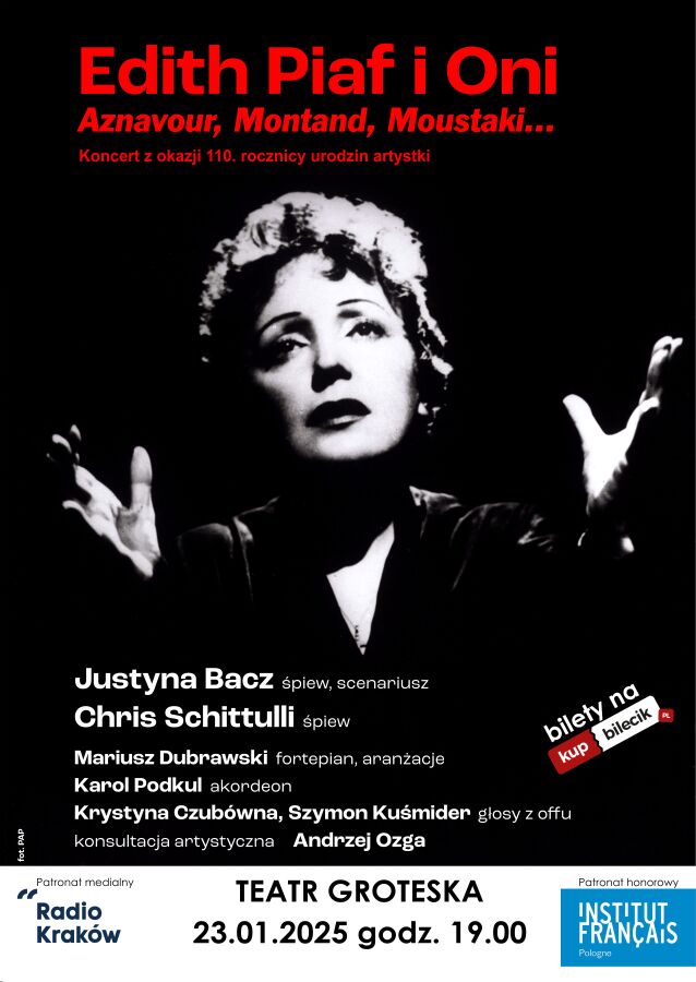 Teatr Groteska zaprasza dziś, 23 stycznia, o godz. 19.00, na koncert „Edith Piaf i Oni”, który osnuty jest wokół relacji artystki z najważniejszymi mężczyznami jej życia. Oprócz wielkich przebojów Piaf będzie można usłyszeć znane utwory z repertuaru m.in. Yvesa Montanda, Charlesa Aznavoura, Georgesa Moustakiego, czy Gilberta Bécaud.