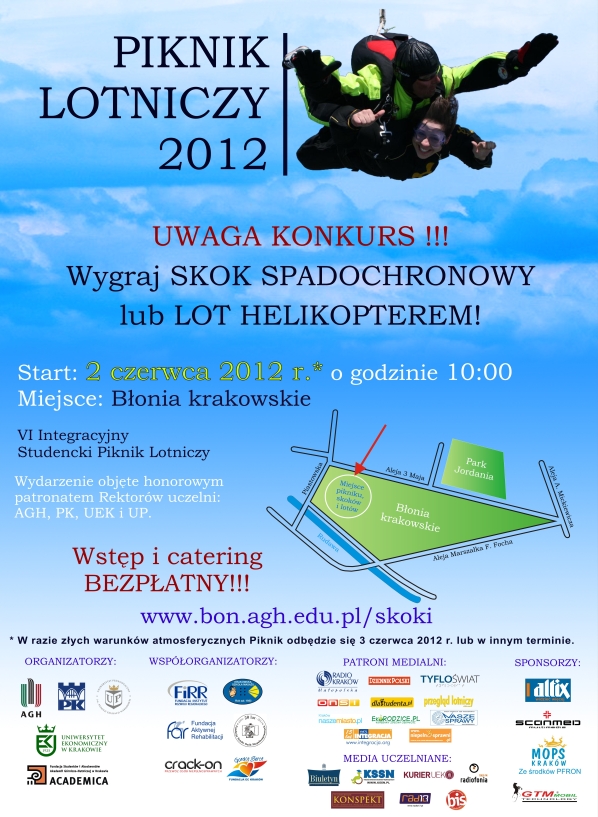 3 czerwca na Krakowskich Błoniach odbędzie się kolejny - VI już Integracyjny Studencki Piknik Lotniczy organizowany przez Biuro ds. Osób Niepełnosprawnych AGH oraz Fundację ACADEMICA. Jak co roku nie zabraknie atrakcji, a dla osób chętnych do podjęcia wyzwania organizatorzy przewidują konkurs w którym nagrodami będą aż 2 skoki spadochronowe oraz 20 lotów turystyczno-krajobrazowych nad miastem.