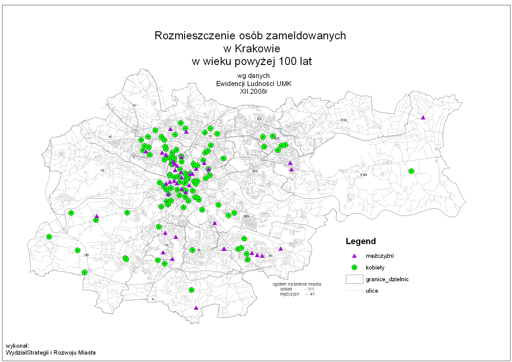Rozmieszczenie osób zameldowanych w Krakowie w wieku powyżej 100 lat
