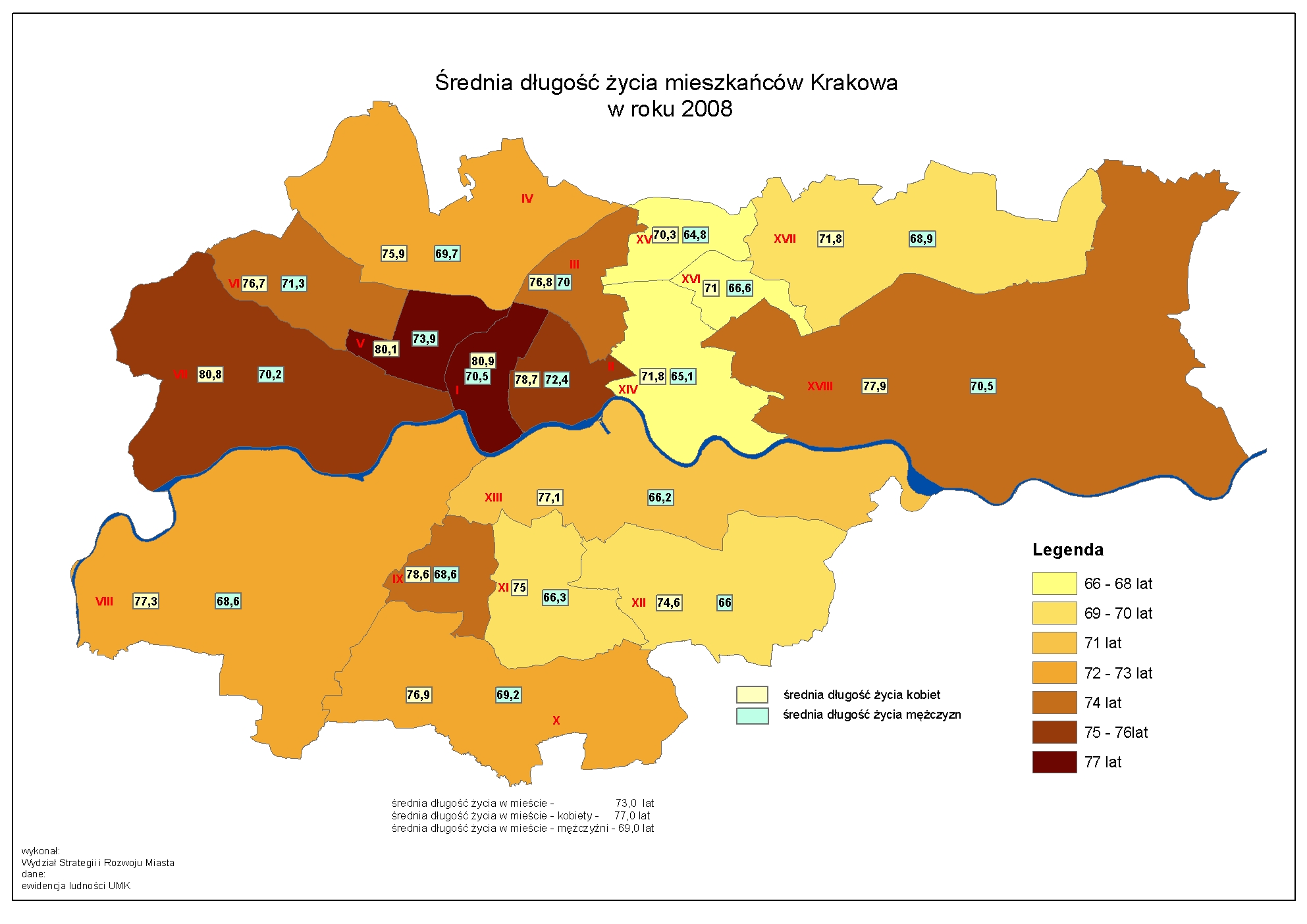Średnia długość życia mieszkańców Krakowa w 2008r.