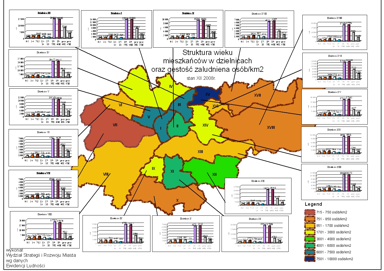 Struktura wieku mieszkańców w dzielnicach oraz gęstość zaludniena osób/km2
