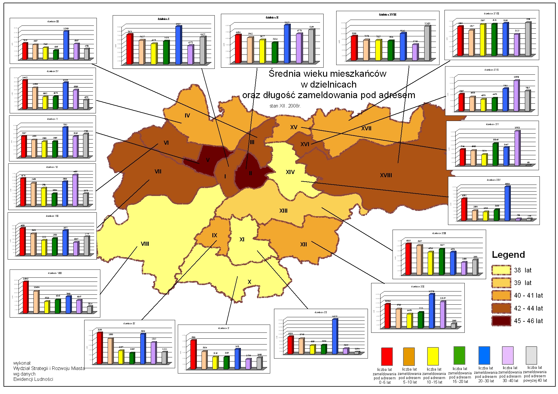 Średnia wieku mieszkańców w dzielnicach oraz długość zameldowania pod adresem