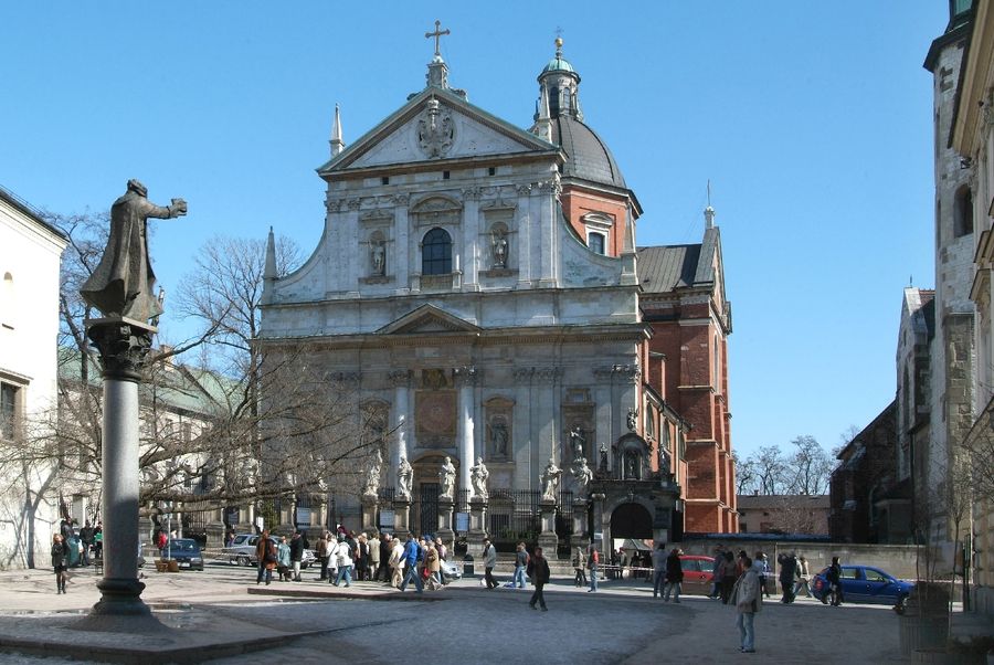 Jezuici przybyli do Polski wkrótce po zakończeniu soboru trydenckiego w 1563 roku. Zgodnie z jego myślą mieli bronić wiary katolickiej przed wpływem idei reformacyjnych. Dzięki poparciu króla Stefana Batorego otrzymali krakowski kościół św. Barbary, przy którym powstała też skromna rezydencja zakonu. Niebawem okazało się jednak, że ze względu na niewielkie rozmiary kościoła, powinność duszpasterska nie może być realizowana w należyty sposób. Tak narodziła się idea budowy nowej świątyni, a wybór padł na teren przy ulicy Grodzkiej, w sąsiedztwie klasztoru klarysek. Dzięki wstawiennictwu księdza Piotra Skargi, król Zygmunt III Waza przeznaczył na fundację odpowiednie środki i w latach 1597-1619 wzniesiono nowy kościół. Jezuicka świątynia był pierwszą na terenie Polski, zbudowaną w nowym podówczas, barokowym stylu.