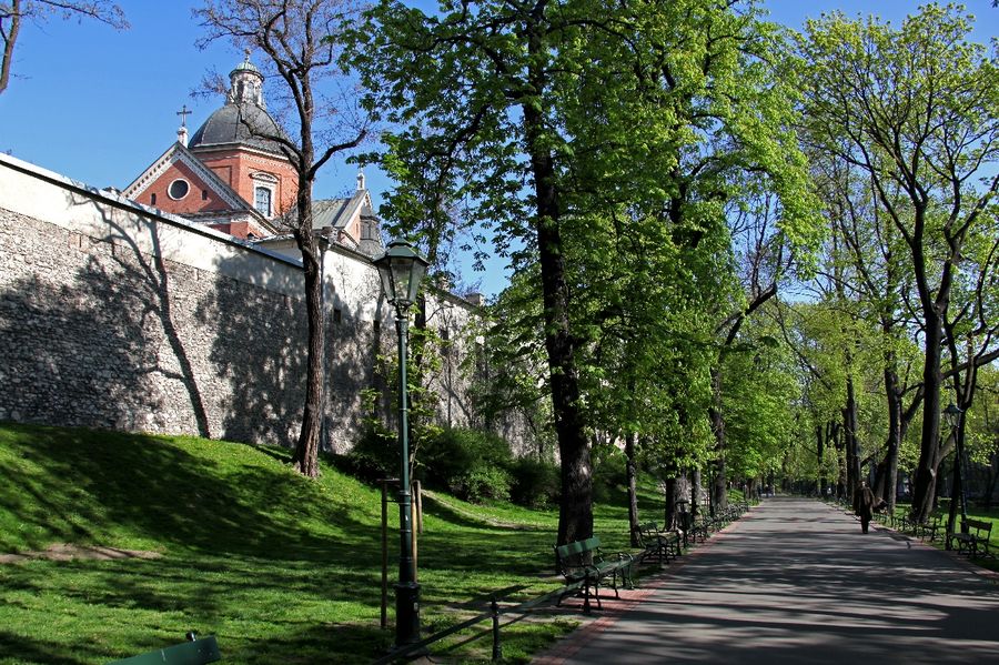 Planty powstawały w kilku etapach. Najpóźniej (ok. 1880 r.) urządzono część pomiędzy Barbakanem, a wylotem ul. Sławkowskiej, stanowiącą dotąd fragment kleparskiego targowiska. Ważnym akcentem stała się tradycja ustawiania na Plantach pomników. Pierwszy obelisk, ustawiony naprzeciw dworca kolejowego, upamiętniał Floriana Straszewskiego (1874 r.). Najpiękniej zakomponowane zdają się być pomniki: Lilli Wenedy, Grażyny oraz Bohdana Zaleskiego (zw. też grupą Bojana).
