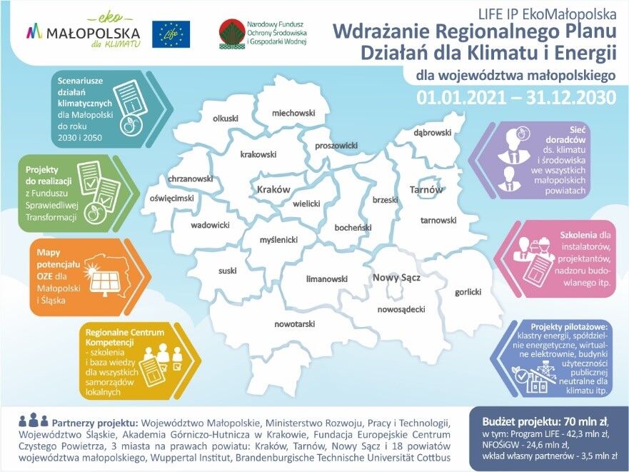 Bazując na dobrych praktykach i zdobytych doświadczeniach w projekcie zintegrowanym LIFE Wdrażanie Programu ochrony powietrza dla województwa małopolskiego – Małopolska w zdrowej atmosferze, postanowiono w podobny sposób podejść do tematu, tym razem skupiając się na ochronie klimatu, a nie tylko na poprawie jakości powietrza.