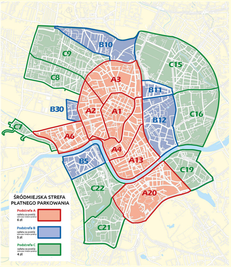 Mapa ma charakter wyłącznie poglądowy i nie może służyć do określania granic poszczególnych podstref i sektorów. W tym celu należy się zapoznać z uchwałą Nr LXXXIX/2177/17 Rady Miasta Krakowa z dnia 22 listopada 2017 r. w sprawie ustalenia strefy płatnego parkowania, ustalenia opłat za postój pojazdów samochodowych na drogach publicznych w strefie płatnego parkowania, wprowadzenia opłaty abonamentowej dla niektórych użytkowników dróg oraz sposobu pobierania tych opłat (t.j. Dz. Urz. Woj. Małopolskiego z 2021 r. poz. 3515 ze zm.).