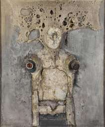 Stojąc przed obrazem Józefa Szajny zatytułowanym "Epitafium" widzimy trójwymiarową postać w stanie rozkładu, jakby zmasakrowane ludzkie szczątki ze zdeformowaną twarzą i odciętymi rękami. Jego szara przygnębiająca kolorystyka została przełamana czerwienią, którą zaznaczone są odcięte kikuty. Całość wykonana jest z rozpadających się resztek, podziurawionych szmat i przetartej tkaniny, co powoduje, że dzieło to ogląda się ze ściśniętym gardłem, czując jednocześnie lęk, wstręt, niepewność i obrzydzenie. Ta poruszająca brzydota uświadamia nam jak krucha jest ludzka egzystencja i jak marne jest to, co po nas zostaje.