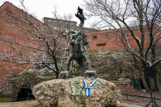 Odsłonięcie tablicy na cokole pomnika Smoka Wawelskiego z okazji 50-lecia powstania rzeźby, autorstwa profesora Bronisława Chromego
