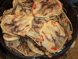 Kaczka - solona, gotowana, w całości, w kawałkach, podawana solo i z ciekawymi dodatkami - to znak rozpoznawczy nankińskiej kuchni. A wszystko zaczęło się ponoć od donośnego piania setek kogutów, które jeszcze w XIV w. królowały w nankińskich zagrodach. Ich krzyki tak dokuczyły rezydującemu w ówczesnej stolicy cesarzowi, że skazał wszystkie stołeczne koguty na skrócenie o głowy. Wierni poddani wdrożyli nakaz i szybko przerzucili się na kaczki. Wkrótce lokalni kucharze stali się wirtuozami kaczych dań i tak pozostało do dzisiaj.Kaczka