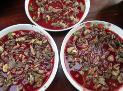 Jeżeli lubicie kulinarne eksperymenty z pewnością spróbujecie również zupy z kaczej krwi. Mieszkańcom naszej części Europy podstawowy składnik potrawy skojarzy się niewątpliwie z czerniną. Jednak smak tego chińskiego specjału w niczym jej nie przypomina. To niewątpliwie zasługa dodatków takich jak: małe suszone krewetki, suszone smażone tofu, kacze żołądki i wątróbki, kminek, czy imbir. Przygotowana zgodnie z najstarszymi tradycjami zupa zawierać powinna również ponad 20 ziół leczniczych, które poprawiają krążenie, usuwają toksyny Zupa z kaczej krwiz organizmu, rozgrzewają i... upiększają. Jeżeli chcemy rozgrzać się taką egzotyczną potrawą podczas spacerów po Nankinie, to ponoć najsmaczniejsza i najtańsza jest u ulicznych sprzedawców! Serwują oni również nieco mniej kontrowersyjną zupę z kaczki bez dodatku krwi, ale za to z mlekiem. Całości dopełniają solone pędy bambusa, grzyby i szynka.
