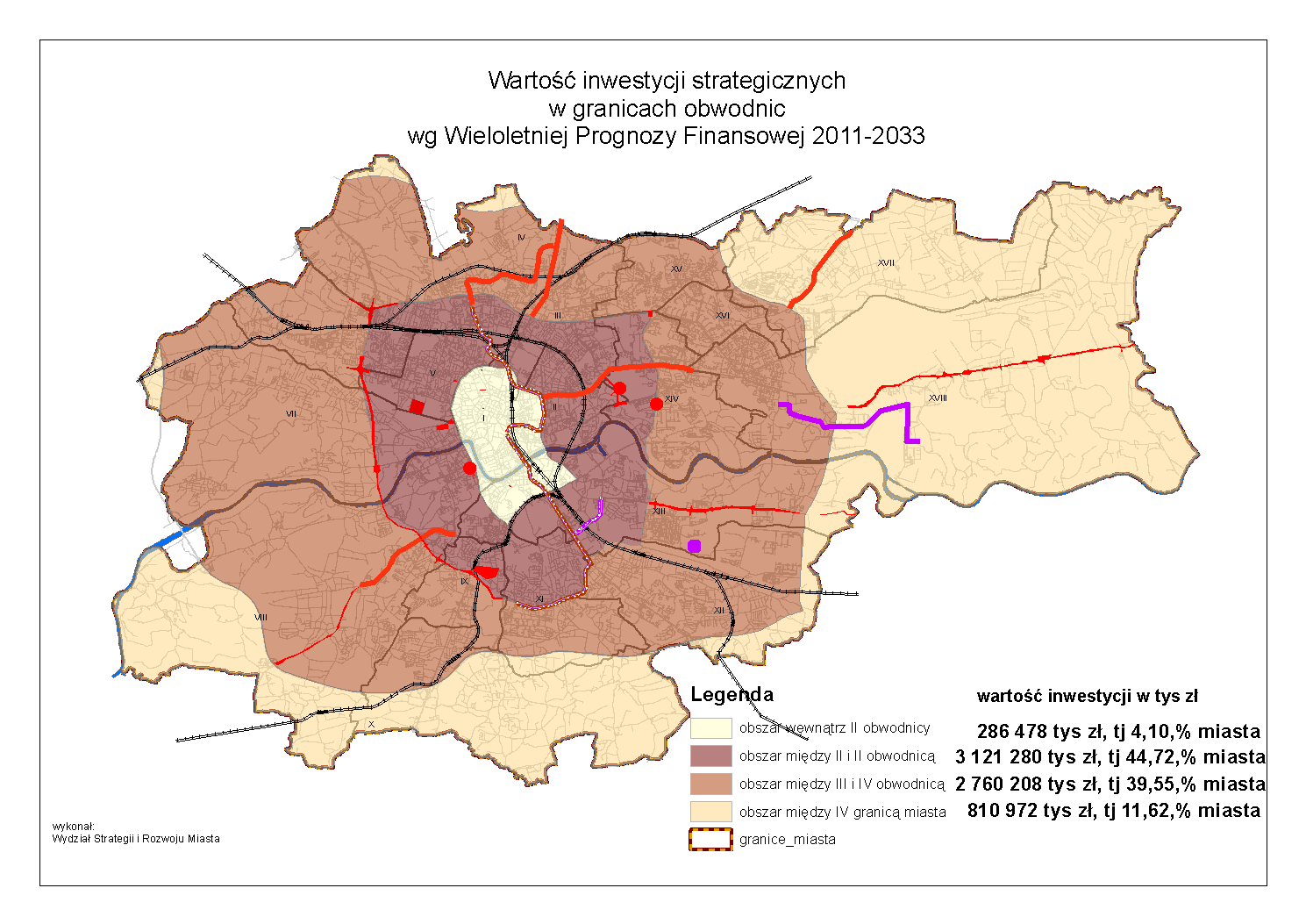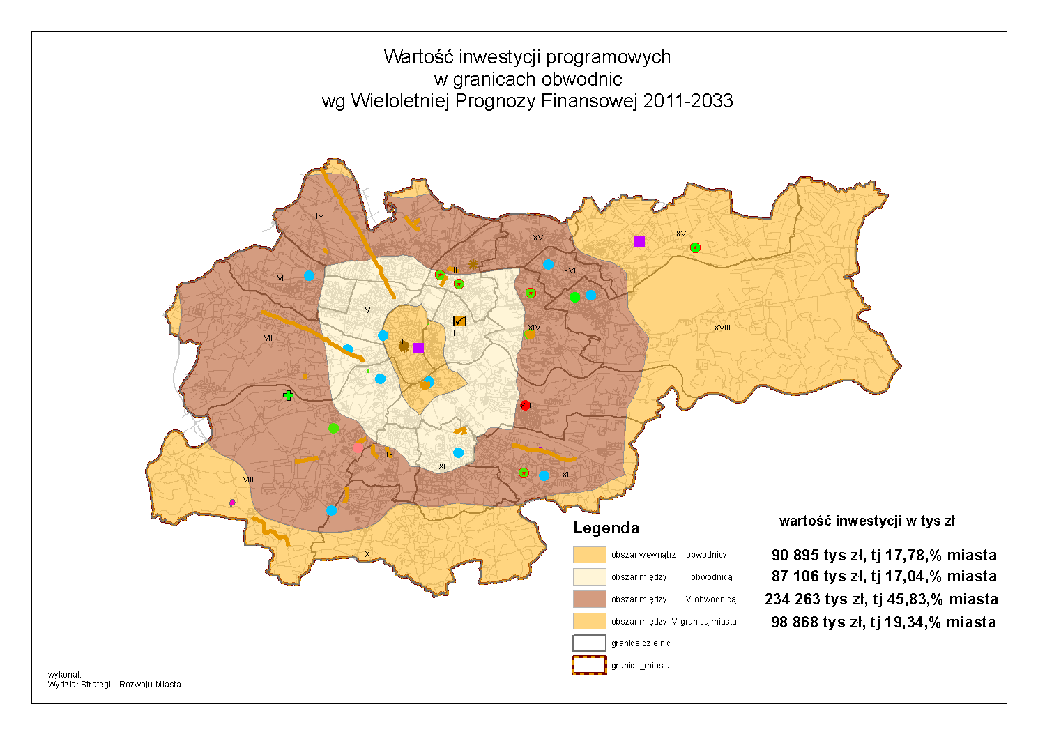 Miasta Krakowa na lata 2011 - 2033 - legenda - Wartość inwestycji programowych w granicach obwodnic wg Wieloletniej Prognozy Finansowej 2011-2033